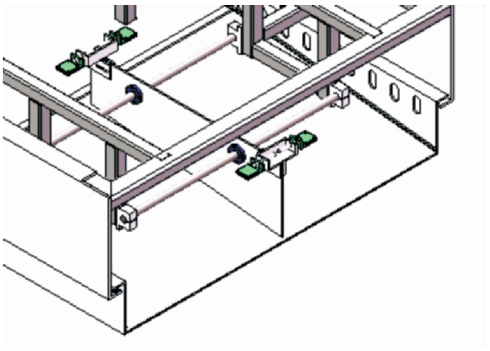 撥板機(jī)構(gòu)是碼垛機(jī)構(gòu)中的關(guān)鍵結(jié)構(gòu),是保證料包整齊排列的重要執(zhí)行機(jī)構(gòu),主要包含撥板、法蘭滑塊和導(dǎo)軌,其主要機(jī)械結(jié)構(gòu)如圖4所示。根據(jù)設(shè)計(jì)要求,抽板底板尺寸寬為2 200 mm,長(zhǎng)為1 300 mm,底板為斜坡狀,與水平面夾角為6°。撥板通過(guò)導(dǎo)柱的法蘭滑塊相連,可在導(dǎo)柱上滑動(dòng),撥板2個(gè)頂角通過(guò)同步帶壓板及連接裝置與同步帶相連,在同步帶的驅(qū)動(dòng)下左右移動(dòng),完成擺包動(dòng)作。撥板與法蘭滑塊相連,安裝在直線導(dǎo)軌上,直線導(dǎo)軌設(shè)計(jì)尺寸為φ=40 mm,長(zhǎng)度l=1 500 mm,安裝在主框架上。