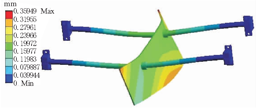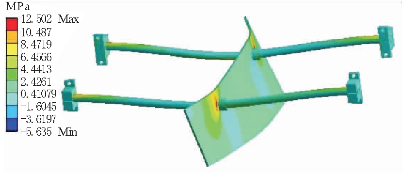 根據(jù)圖8撥板機(jī)構(gòu)的變形云圖可知,導(dǎo)柱上的大變形發(fā)生在中點(diǎn)位置,大值約為0.239 mm;撥板的大變形發(fā)生在驅(qū)動(dòng)力作用的2個(gè)角部以及下部中點(diǎn)位置,角部大變形為0.359 mm,下部中點(diǎn)位置大變形為0.319 mm。而對(duì)于大應(yīng)力部分,由圖9可知,導(dǎo)柱上主要出現(xiàn)在左端連接處,大值為10.912 MPa,撥板上的大應(yīng)力出現(xiàn)在撥板連接孔與驅(qū)動(dòng)力所在點(diǎn)的連線上,大值為12.502 MPa。